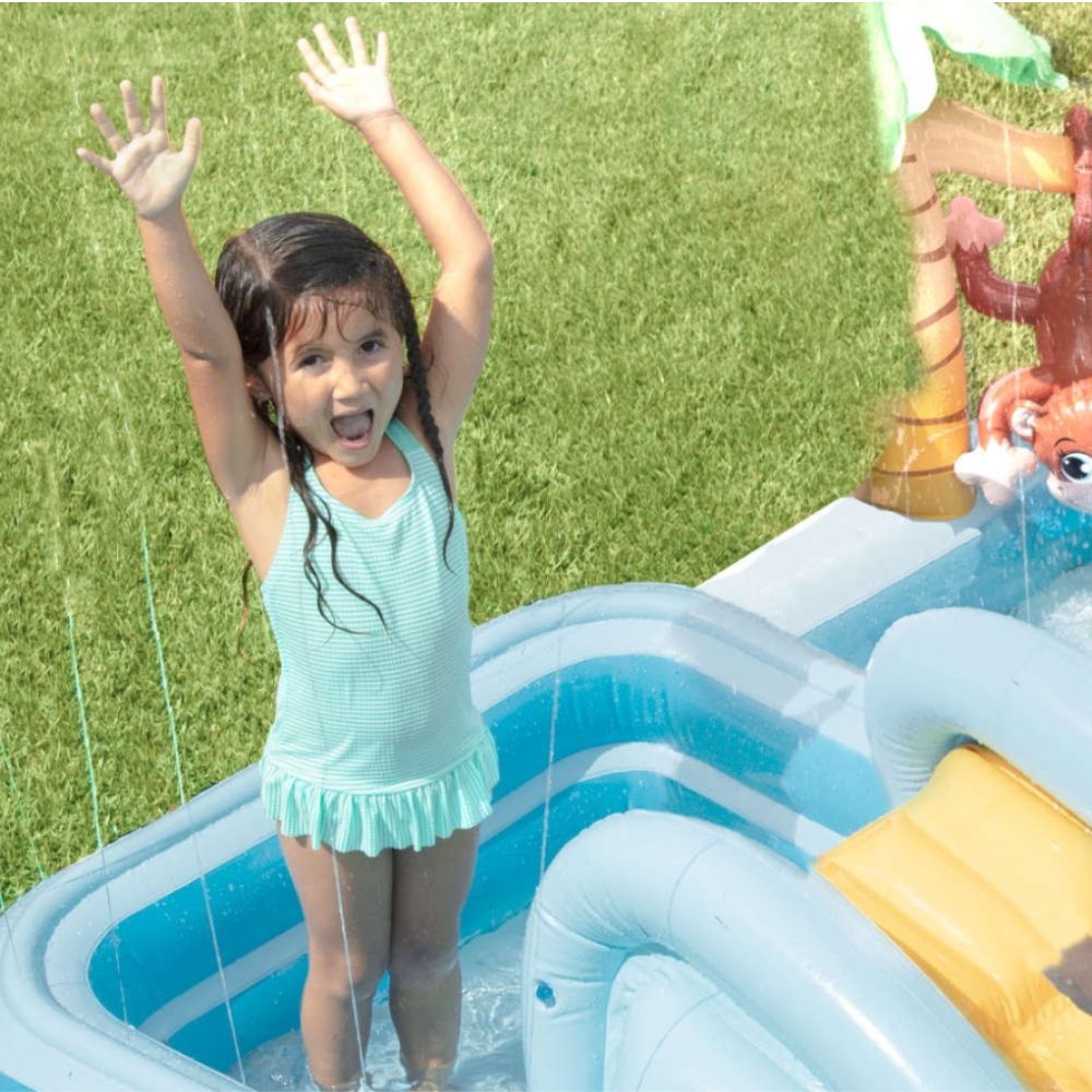 חווית המשחק מתחדשת עם מתזים שמחוברים לצינור גינה ומפיצים מים על המגלשה ובסביבות הבריכה, להנאה מרבית.