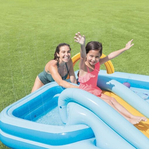 הבריכה המרהיבה מבית אינטקס כוללת שני אזורים נפרדים על משטח אחד, עם מגלשה מהנה, 5 כדורים צבעוניים ומשחקים מתנפחים.