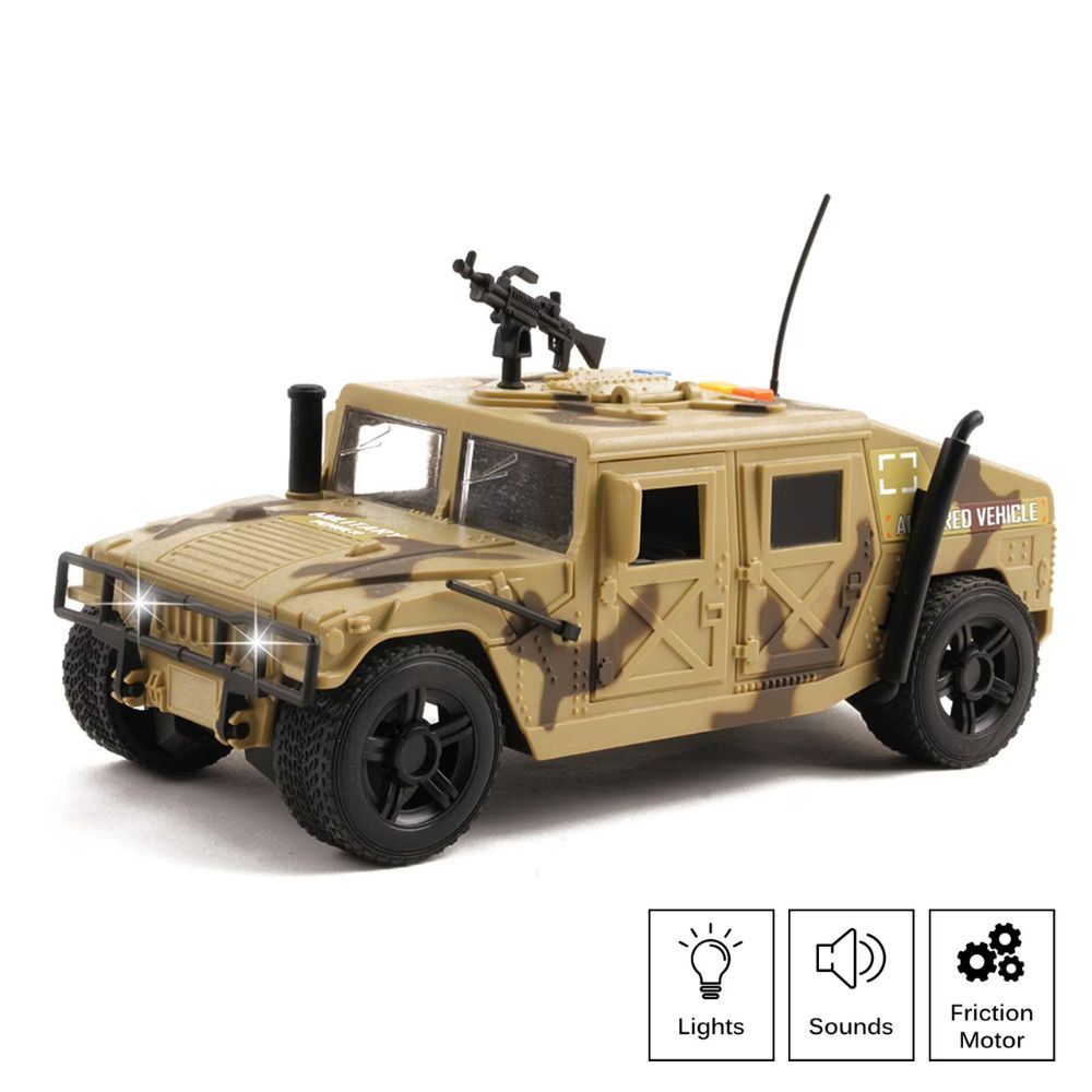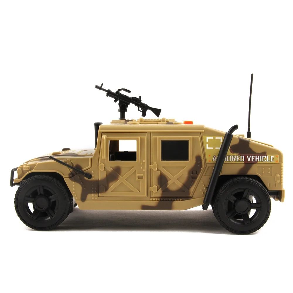 ג’יפ צבאי איכותי בקנה מידה 1:16 עם מנגנון דחיפה, דלתות נפתחות, אפקטים של אורות וצלילי קרב.