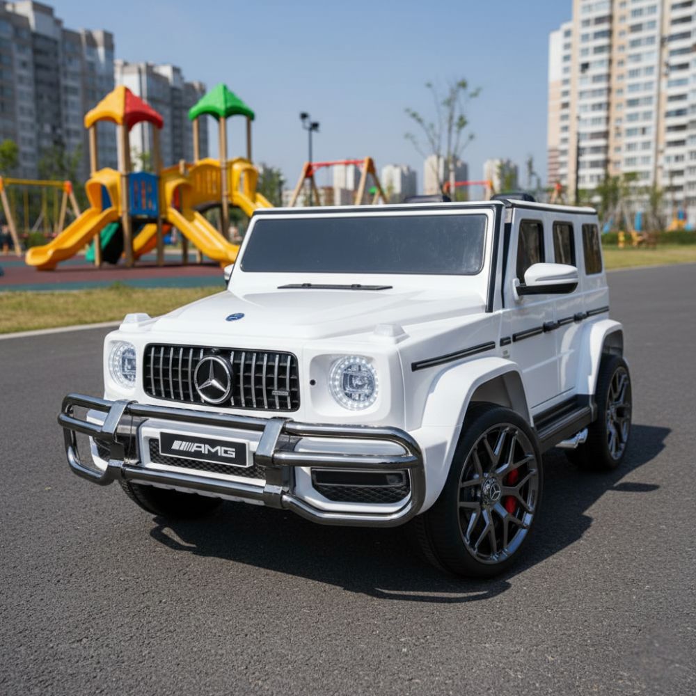 מרצדס G-Class ענקית בגרסת 24V עוצמתית עם הנעת 4X4, שני מקומות ישיבה נפרדים וגלגלי גומי לנסיעה שקטה.