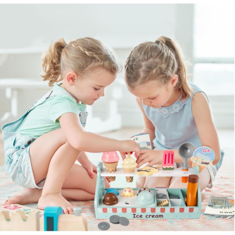 דלפק הגלידה עשוי מחומר עץ איכותי, יציב ומשטח חלק, כך שהילדים יכולים לשחק בו בבטחה.