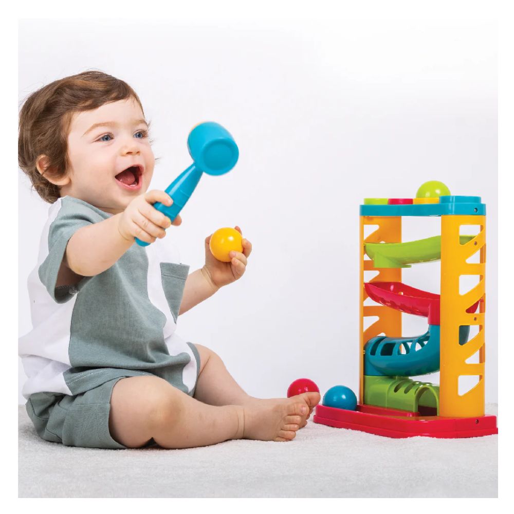 המשחק המהנה הזה מזמין את הפעוט להתאים את צבעי הכדורים לצבעי הטבעות העליונות, להכות בפטיש ולראות כיצד הכדורים מתגלגלים למטה.