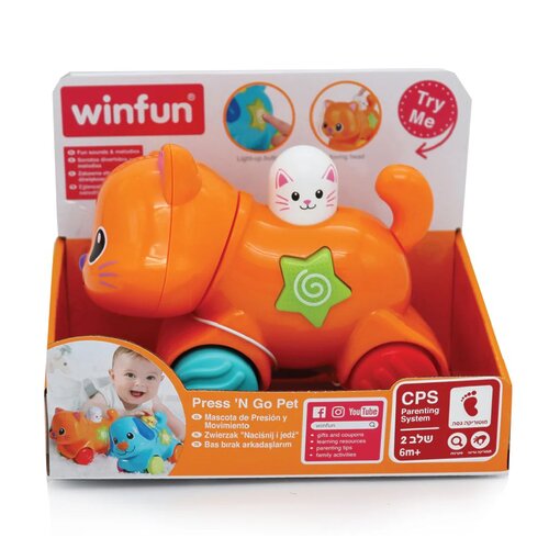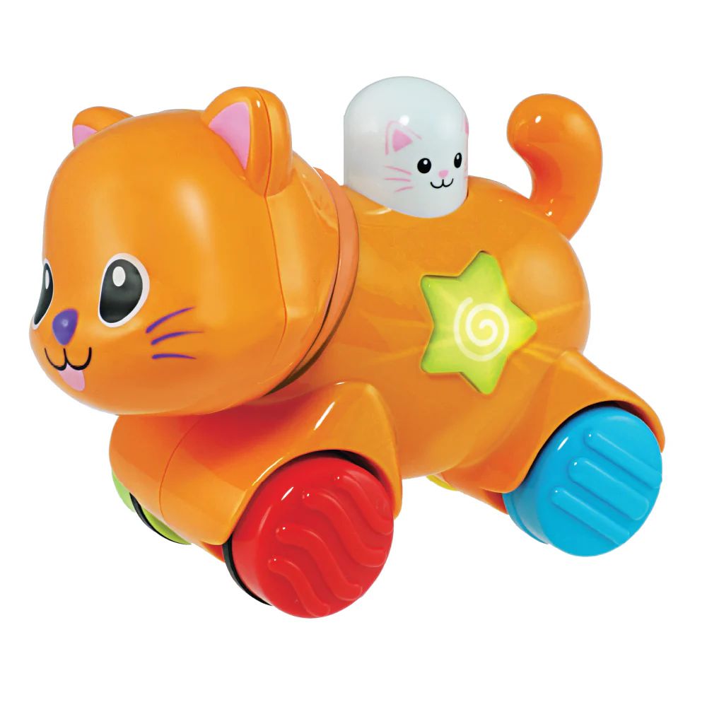 בלחיצה על כפתור, החתלתול נוסע ומניע את ראשו. מעודד זחילה, תנועה והתפתחות רב-חושית. מתאים מגיל 6 חודשים.