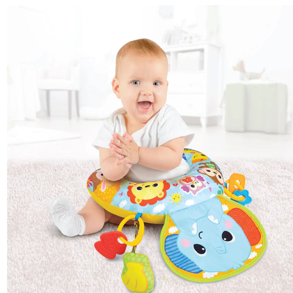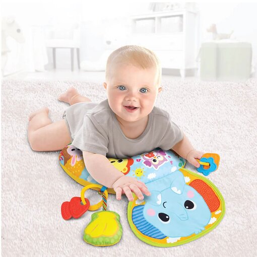 כרית זמן בטן נעימה ורכה, מעוצבת במיוחד עם מנגינות משעשעות ודמות פיל מתוק מבד קדמי, היוצרת רעשי קמטוטים המסקרנים את התינוק ומעודדים חקר ולמידה תוך שכיבה על הבטן.