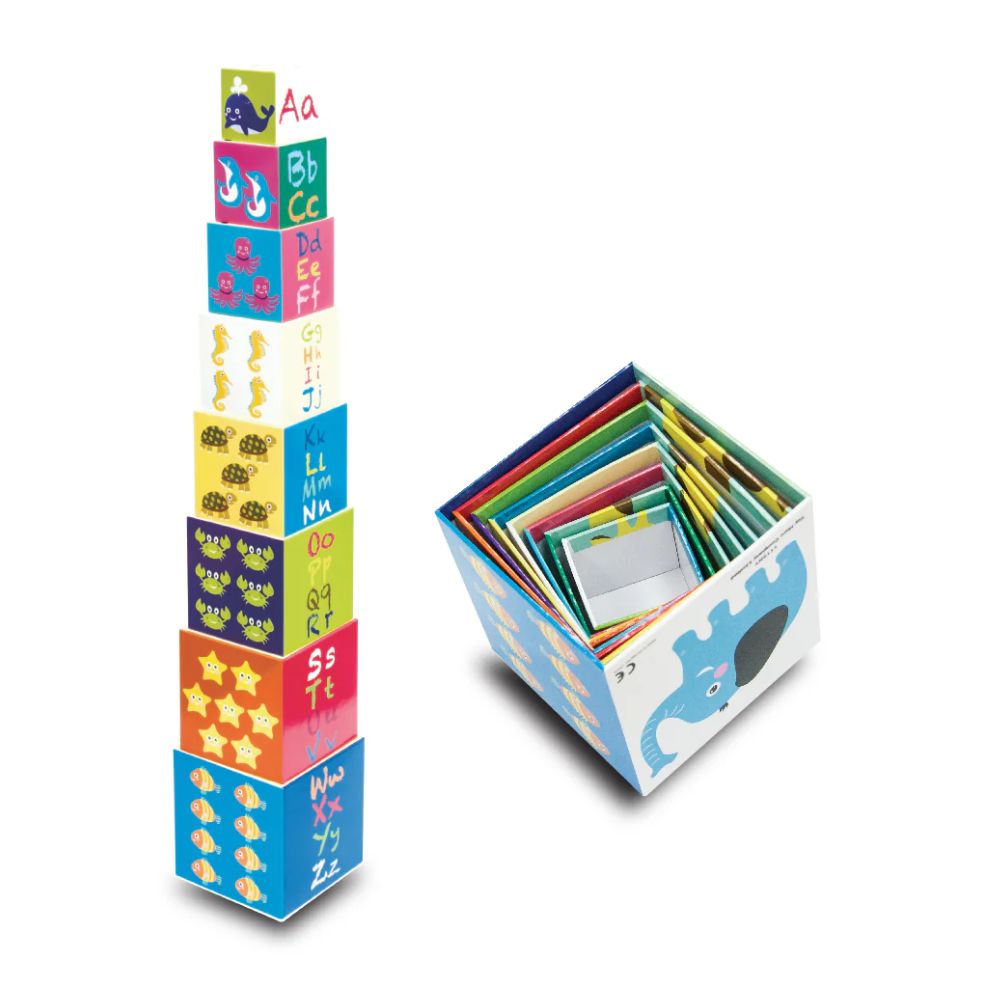 מגדל קוביות צבעוניות ומאוירות בדמויות חביבות, המתאים לפיתוח יכולות קוגניטיביות ומוטוריות.