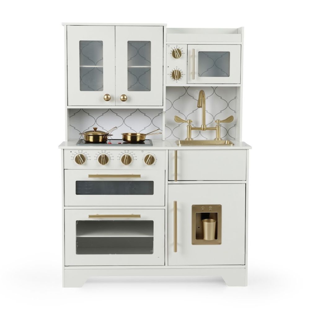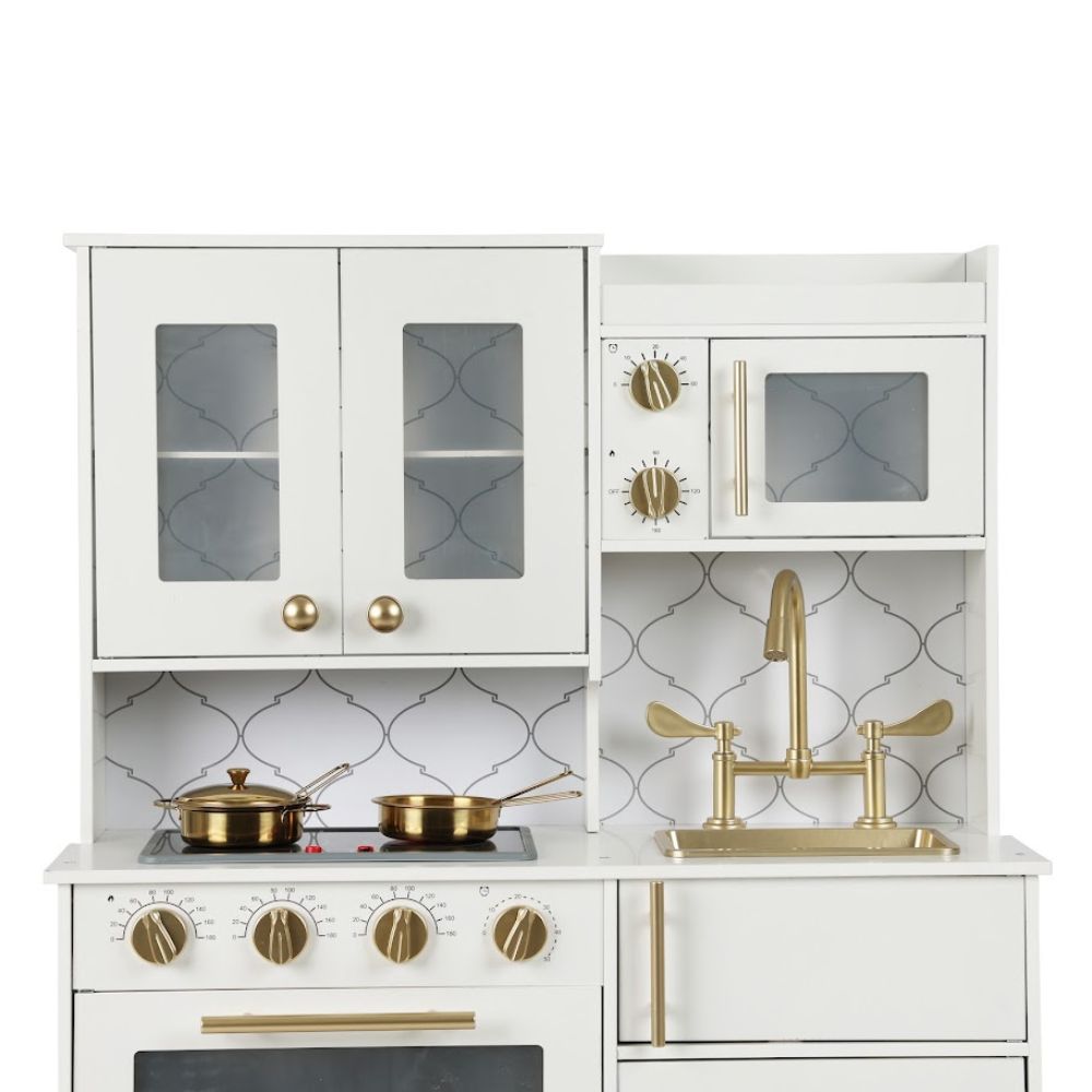 המטבח מעוצב בשילוב צבעים קלאסי של לבן וזהב, ומעניק לילדיכם חוויית משחק מציאותית ומרגשת המדמה מטבח ביתי אמיתי.