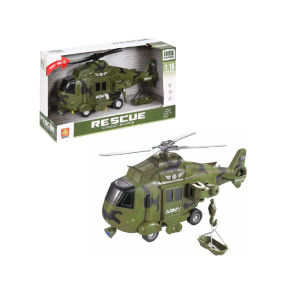 מסוק צבאי לילדים בקנה מידה 1:16 עם אורות, צלילים, פרופלורים מסתובבים ועמדת ירי נעה. צעצוע מושלם להרפתקאות ודמיון.