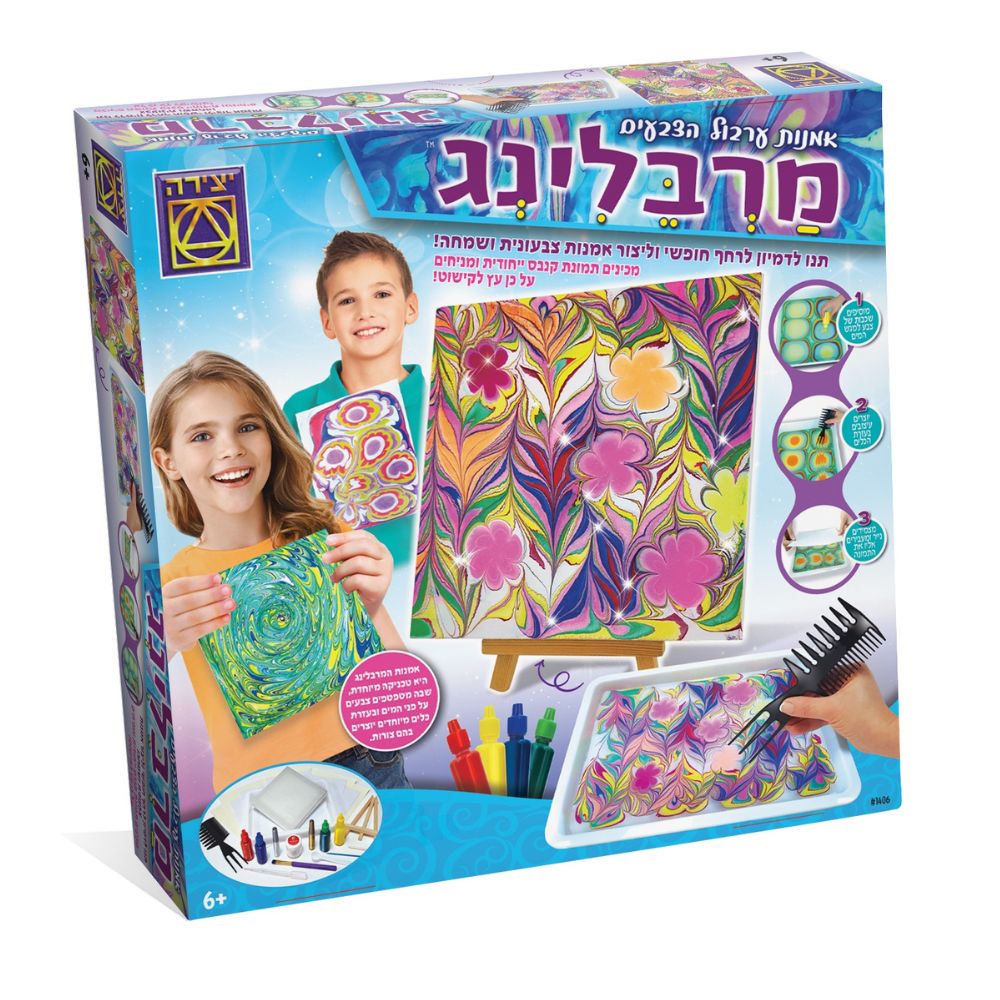 ערכת מרבלינג מבית משחקי יצירה – יוצרים דוגמאות צבעוניות במים ומעבירים לנייר ליצירה מרהיבה. לגילאי 6+.
