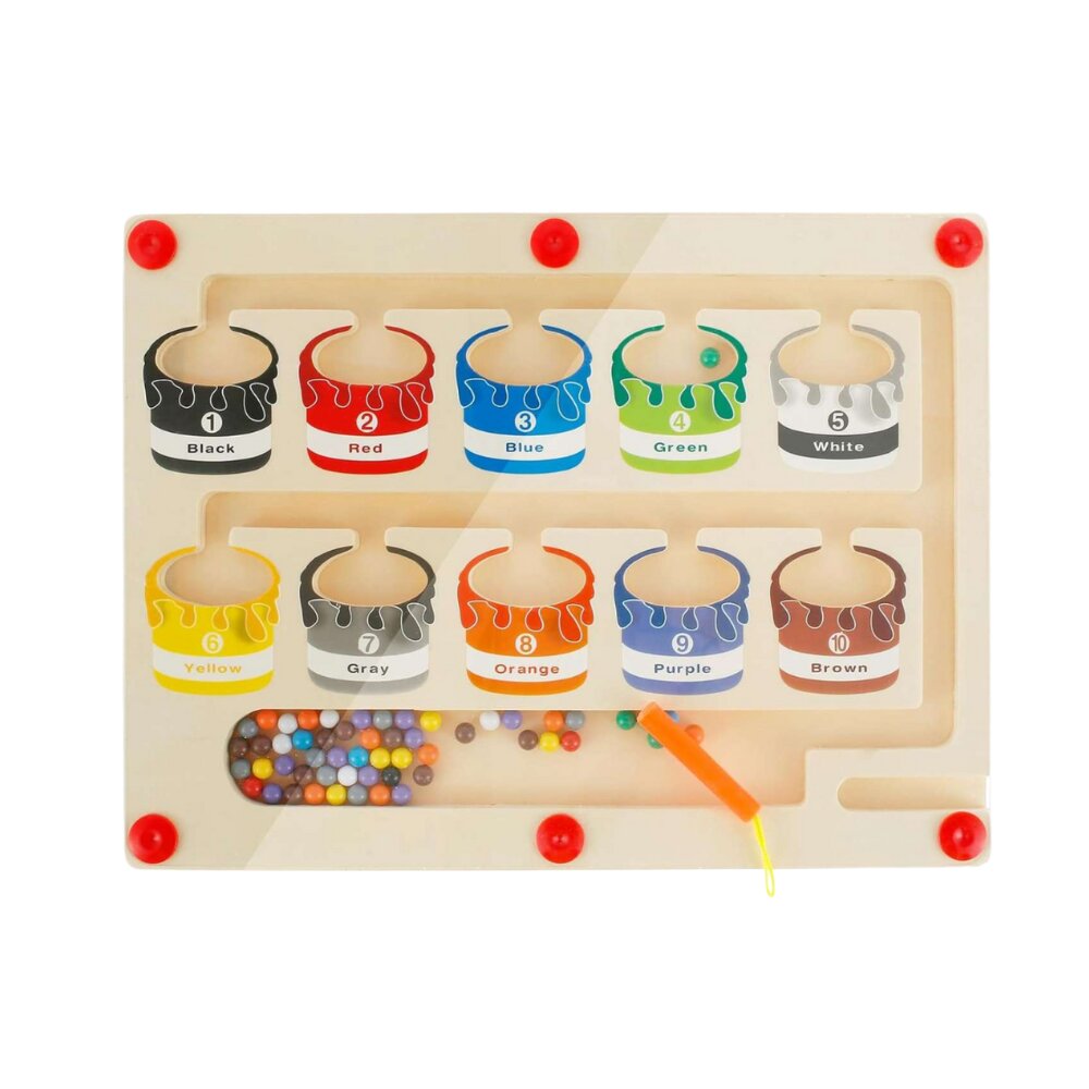 לוח המבוך העשוי מעץ איכותי כולל 10 פחי צבע ממוספרים (1-10) ו-65 חרוזים מגנטיים צבעוניים לפעילות של ספירה, מיון ולימוד צבעים – בצורה מהנה, נקייה וללא בלגן.