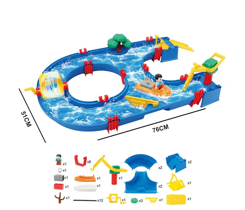 משחק פעילות חול ומים מפלסטיק לילדים במידות 76X51 ס”מ. הורים וילדים יכולים לשחק יחד לקשר אינטימי יותר. משחק הרכבה מסלול מים לפעילות חול ומים מעורר השראה בהתפתחותם האינטלקטואלית של הילדים, משפר את יכולת הילדים להתמודד עם משימות מעשיות. המסלול כולל אביזרים נלווים נהדרים המעבירים מים במסלול ליצירת משחק זורם. במערך המשחקים ניתן למצוא סירות צעצוע, דמויות , מעצור מים, גלגל מים ועוד כדי לסייע בפיתוח דמיון למשחק מהנה או כל דבר שילדיכם אוהבים בדמיונם הפרוע ביותר. המכלול כולו בנוי כך שיהיה בטיחותי לילדים עם פינות מעוגלות וקצוות חלקים. ערכת משחק המים כוללת גלגל משוט, מנוף מגדל, סירת מיכל וסירות מנוע עם 2 בובות, ילדים יכולים לסובב את גלגל ההנעה כדי לגרום למים להזיז את כלי הרכב דרך התעלות, ללמוד על הדינמיקה של מים; ילדים יכולים ללמוד על המכניקה הפיזית של המינוף באמצעות מנוף מגדל כדי לפרוק עומס כבד ערכת המשחק הקלה יציבה היטב על חול, דשא או בטון. לא פשוט להתהפך, במיוחד כאשר ילדים נסחפים עם שימוש חזק. לנוחותכם, ללא שקע לניקוז מים שניתן לחבר או לנתק כדי לתת לחול ולמים החוצה לאחר המשחק. ערכת משחק חול ומים עשויה מחומרים ידידותיים לסביבה ולא רעילים, והיא רעיון מצוין לפעילויות חוץ לילדים מגיל שלוש ומעלה. הוא מגיע באריזה נוחה לנשיאה ומעוצבת ובהחלט מרשים למתנה.