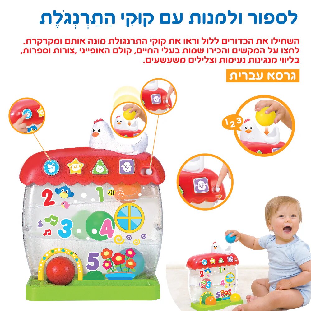 משחק קוקי התרנגולת – צעצוע מדבר לפעוטות עם מנגינות, ספירה, קולות חיות וצלילים.