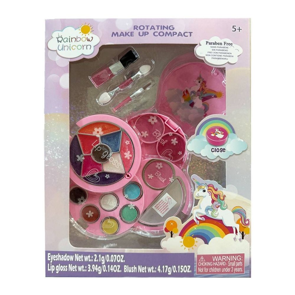 סט איפור לילדים בעיצוב חד קרן ורוד – כולל ליפ גלוסים, צלליות, סמקים ומראה קומפקטית. נפתח בסיבוב ונסגר בקלות. מושלם כמתנה צבעונית ומהנה!