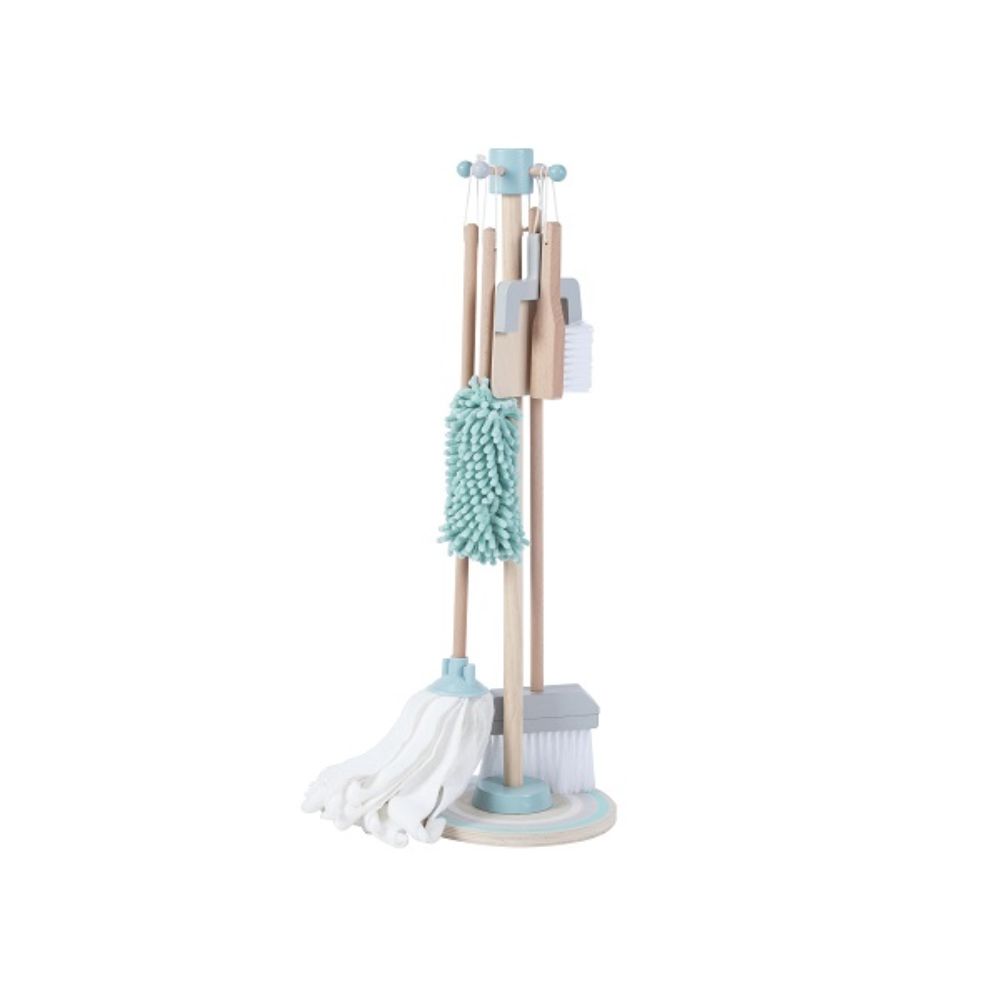 מעמד כלי ניקיון מעץ לילדים בעיצוב פסטל, כולל מטאטא, מגב וציוד ניקוי לתלייה.