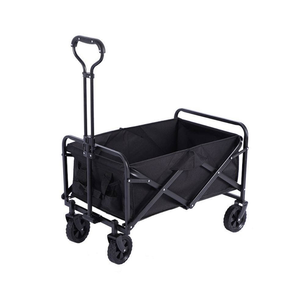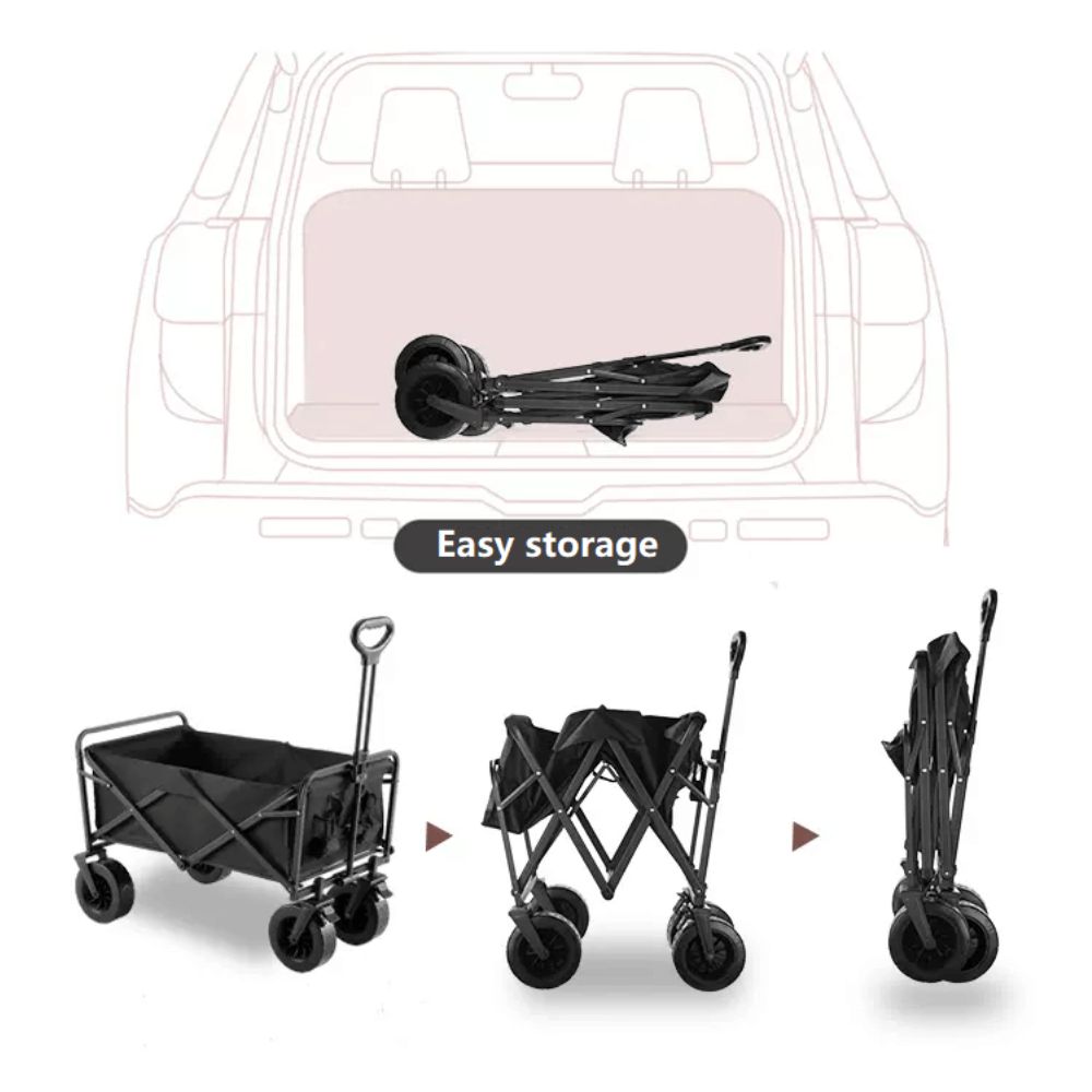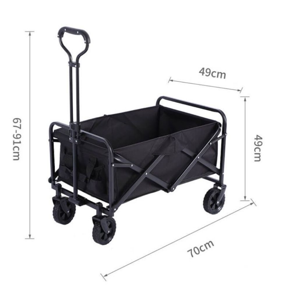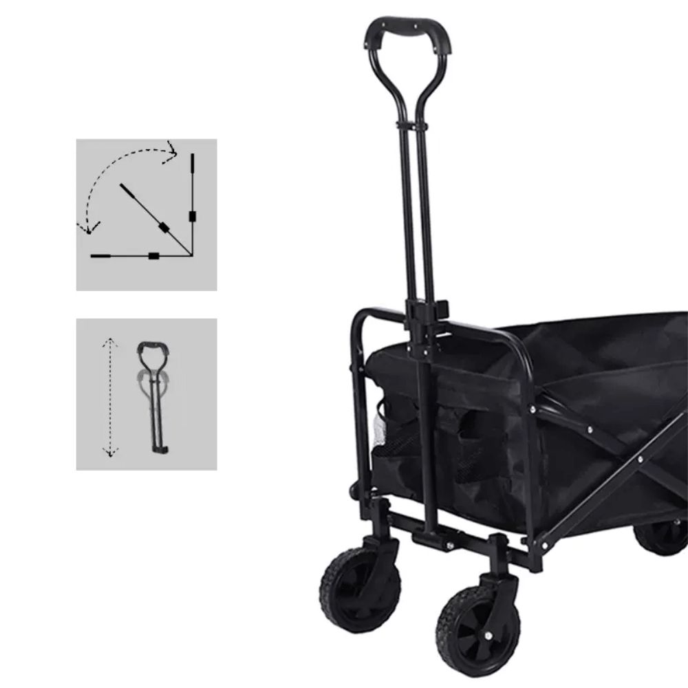עגלת קמפינג מתקפלת עם קיבולת של עד 80 ק”ג, גלגלים גדולים, בד עמיד למים, ידית נשיאה נוחה ו-2 כיסים – מושלמת לחוף, טיולים ופיקניקים.
