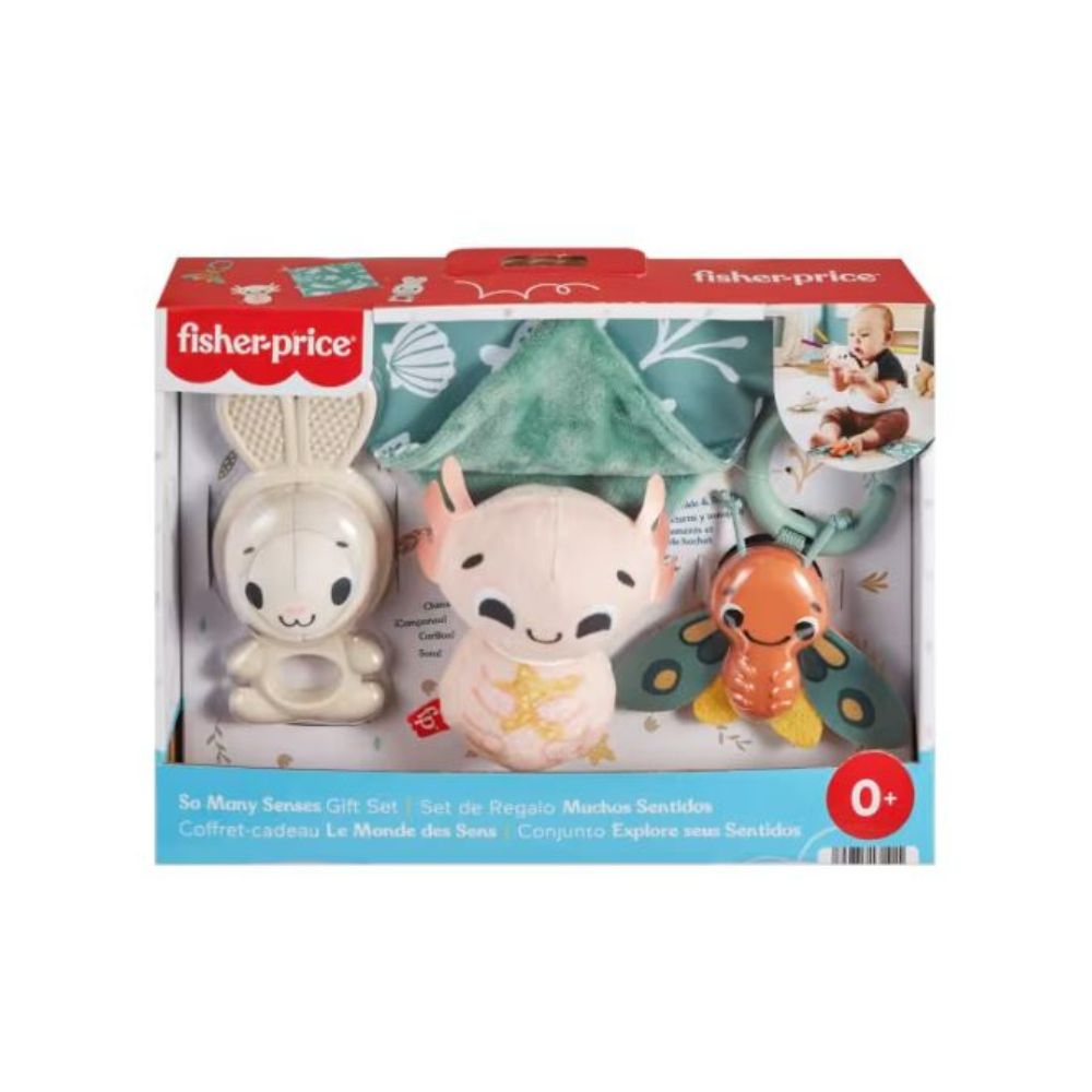 ערכת המתנה So Many Senses מבית Fisher-Price® כוללת 4 צעצועים חושיים לתינוקות, כולל נשכן ארנבת, אקולוטל רך, רעשן עש ופאנל קמט מבד.