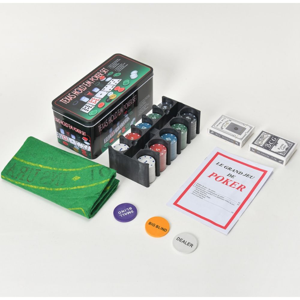 ערכה מושלמת למשחק פוקר עם 200 זוטונים ב-5 צבעים שונים, 2 חבילות קלפים
