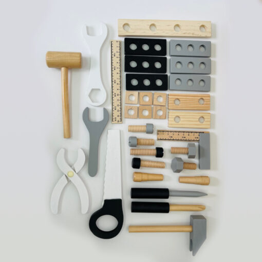 צעצוע לילדים ארגז כלי נגרות מעץ מלא בצבעי עץ,שחור ולבן כולל מגוון רחב של כלי עבודה