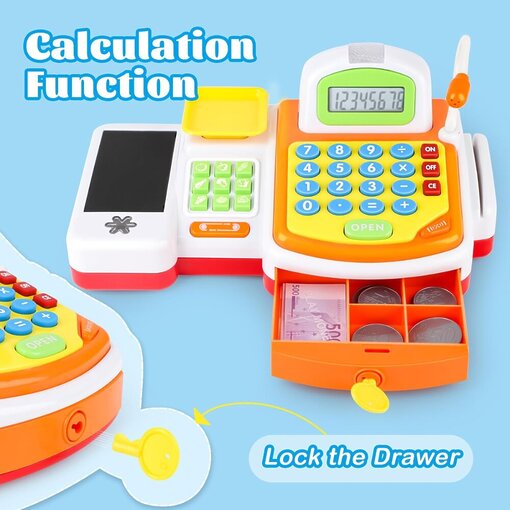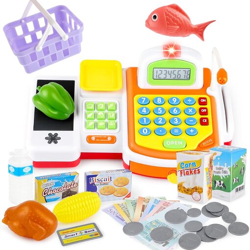 קופה רושמת צבעונית ואינטראקטיבית הכוללת סל קניות, מוצרים, כסף צעצוע, משקל, מיקרופון ומחשבון מובנה.