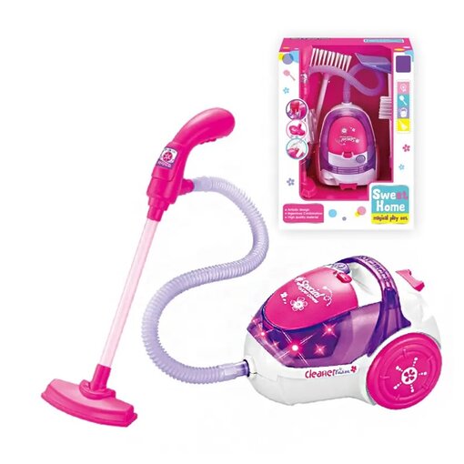 ערכת ניקיון חינוכית לילדים הכוללת שואב אבק עם אפקטים של אור ושאיבה אמיתית, מטאטא, יעה ואביזרים נוספים.