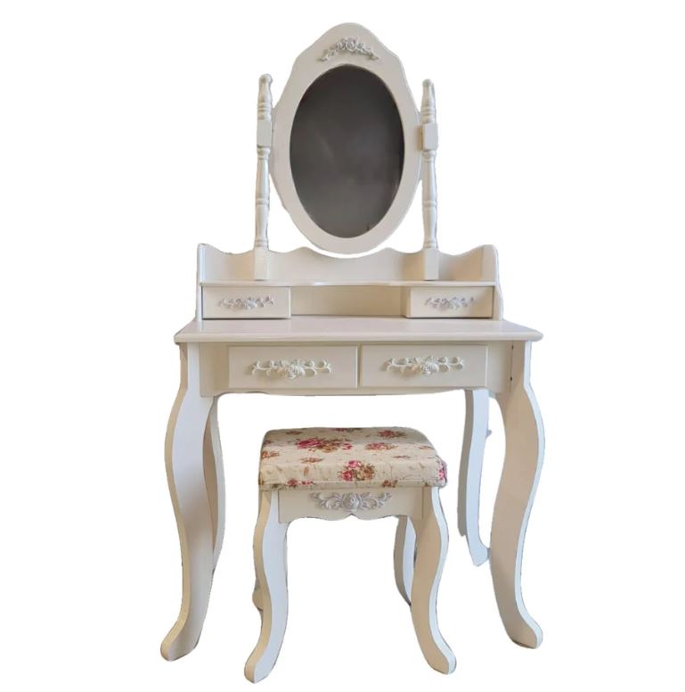 שידת איפור בצבע שמנת מעץ מדהימה לילדים דגם נוגה כולל שולחן ושרפרף, מראה ומגירות אחסון