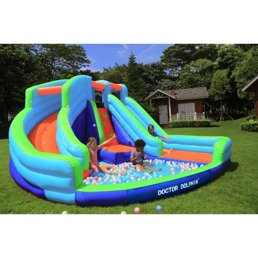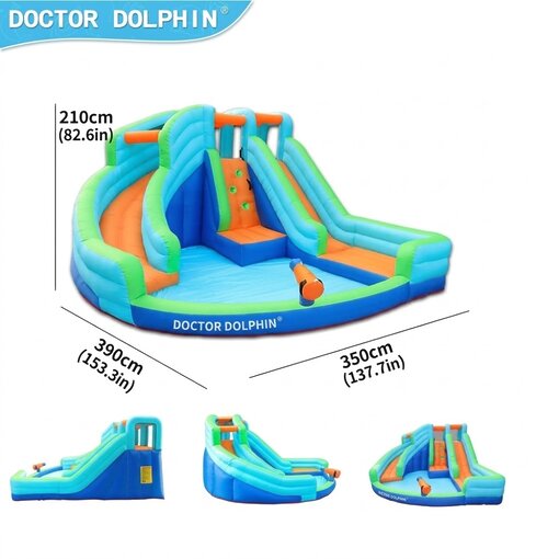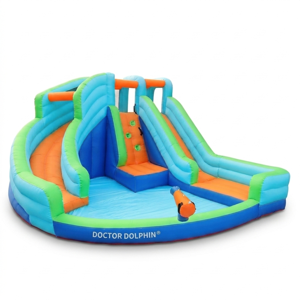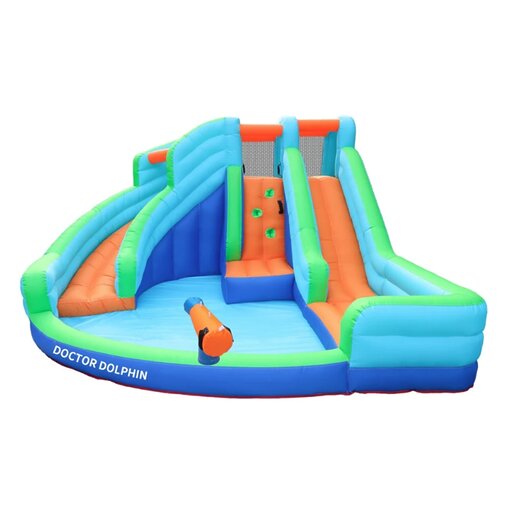 הכירו את המתנפח המרהיב מבית Doctor Dolphin, המשלב קיר טיפוס מאתגר, שתי מגלשות מלהיבות, בריכת כדורים/שיכשוכית ותותח מים לחוויית משחק רטובה ומהנה.