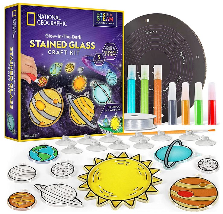 יצירת ויטראז’ יפהפיה בנושא מערכת השמש הכוללת שמונה כוכבי לכת אקריליים ושמש אקרילית אחת שילדכם יוכלו לצבוע עם הצבעים הזוהרים בחושך והצבעים המטאליים הכלולים בערכה. כשהם מסיימים, הם יוכלו לתלות את היצירה שלהם על התקרה או על החלון בעזרת מתלה הואקום המצורף. הערכה מכילה גם חוברת הוראות פשוטה ומדריך למידה מלא בתמונות צבעוניות ועובדות מרתקות על השמש וכוכבי הלכת! מתנה מושלמת לילדים שאוהבים אומנות וכוכבי לכת! הערכה הזו היא דרך מהנה במיוחד לקישוט זהה למערכת השמש שלנו, עם צבעים זוהרים בחושך כדי להאיר את הלילה עם היצירה המדהימה הזו!