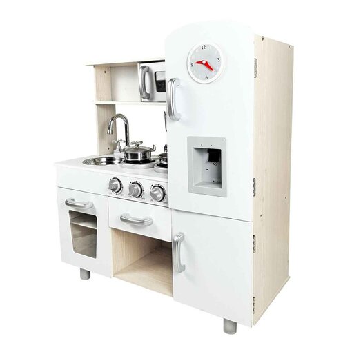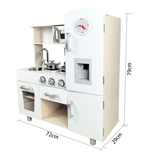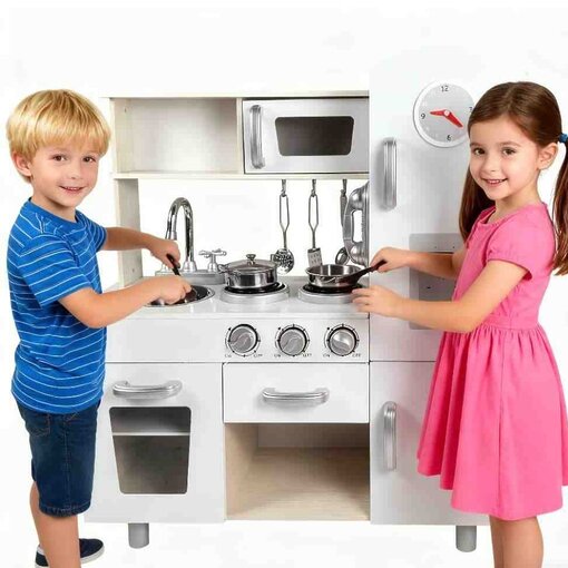 מטבח משחק לילדים דגם ססיליה בעיצוב וינטג’ הכולל טלפון, מכונת קרח עם שעון, ברז מסתובב, תנור, מיקרוגל וכלי בישול – לחוויית משחק מציאותית, מהנה ומלאת דמיון.