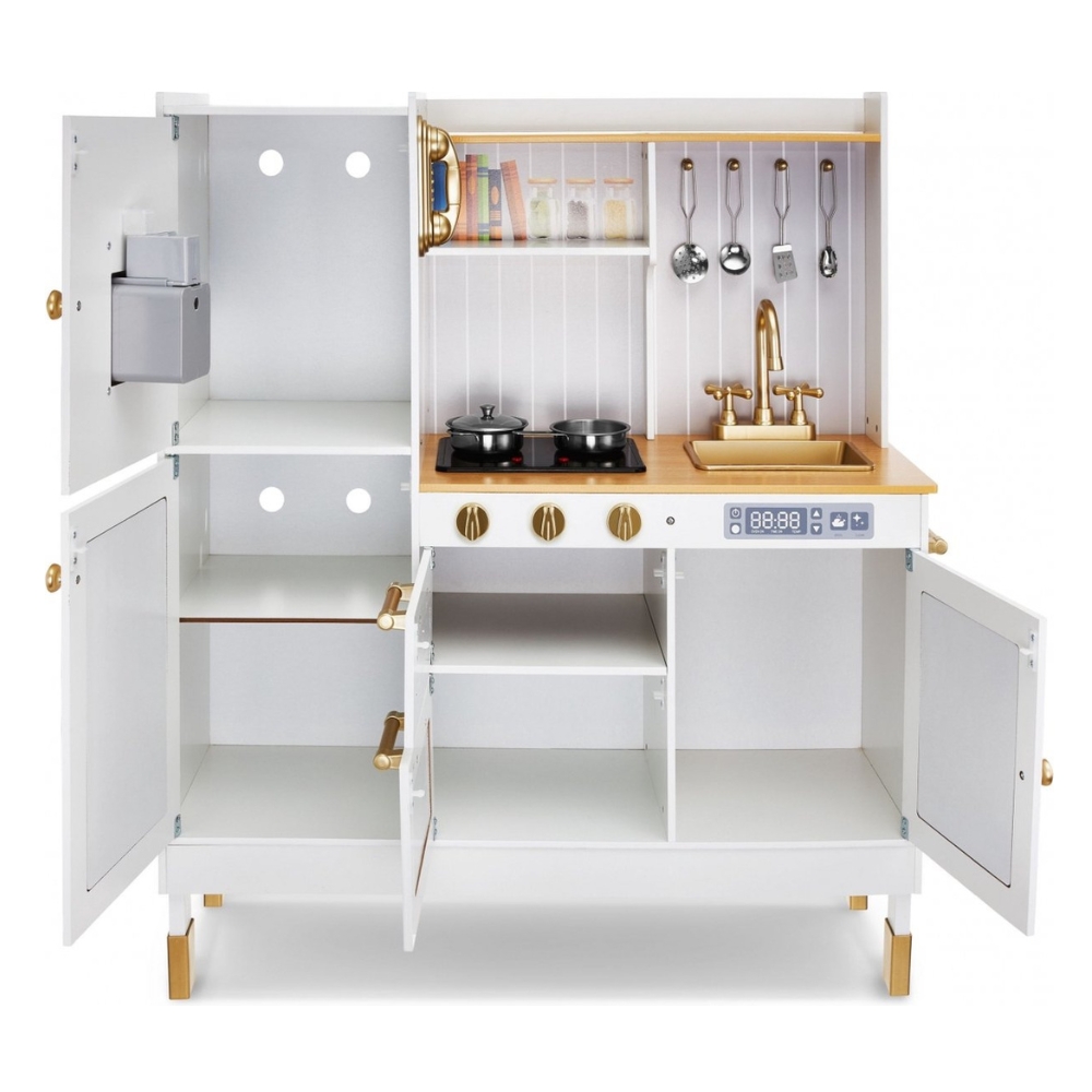 🌟 עיצוב אלגנטי ואיכות ללא פשרות המטבח מגיע בשילוב צבעים קלאסי של לבן וזהב, שמתאים באופן מושלם לכל חדר ילדים או סלון. הוא עשוי MDF מאסיבי ואיכותי המבטיח עמידות לשנים רבות של משחק פעיל.