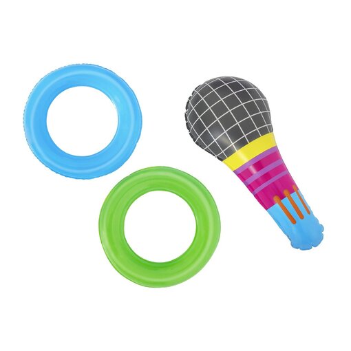 מה במארז: תוף מתנפח, מיקרופון, 2 טבעות, 6 כדורי משחק וטלאי תיקון.