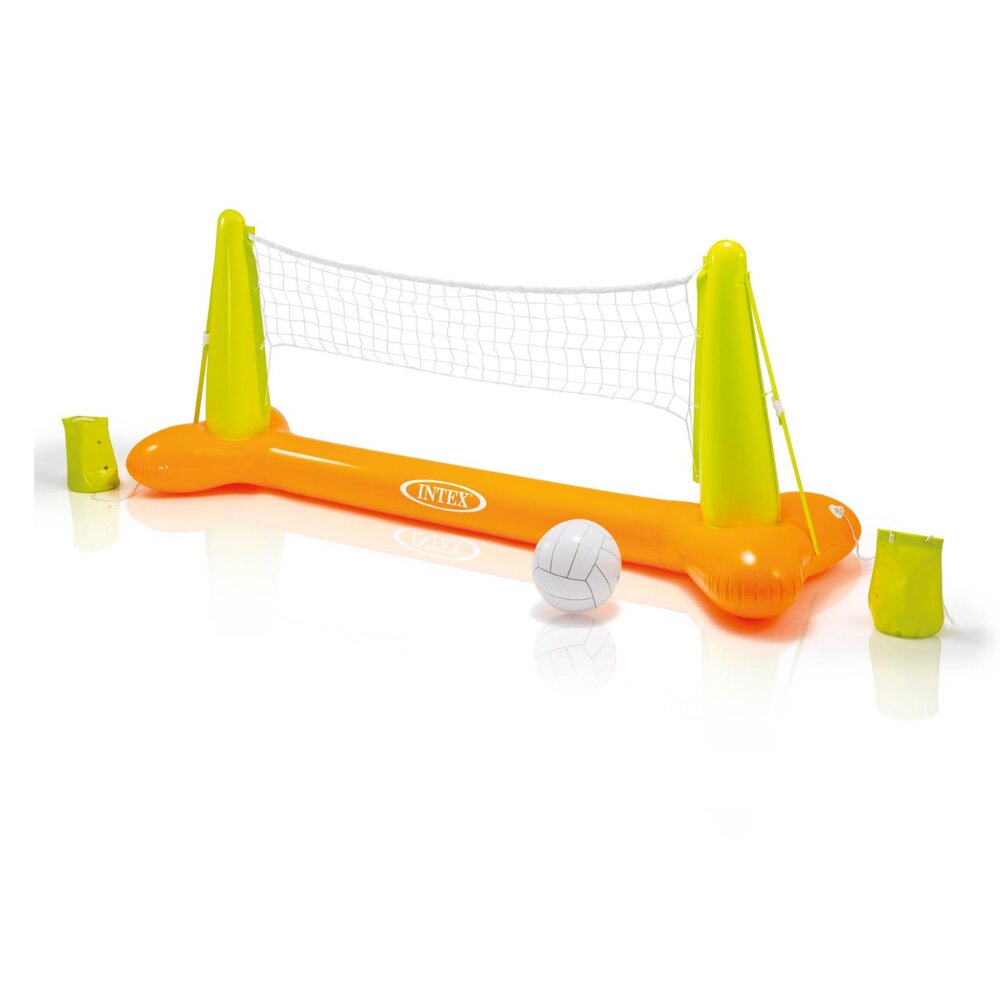 סט משחק כדורעף לבריכה לילדים בצבעי כתום וירוק מבית INTEX דגם 56508 הכולל מתקן בסיס צף עם רשת וכדור.