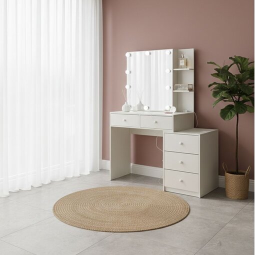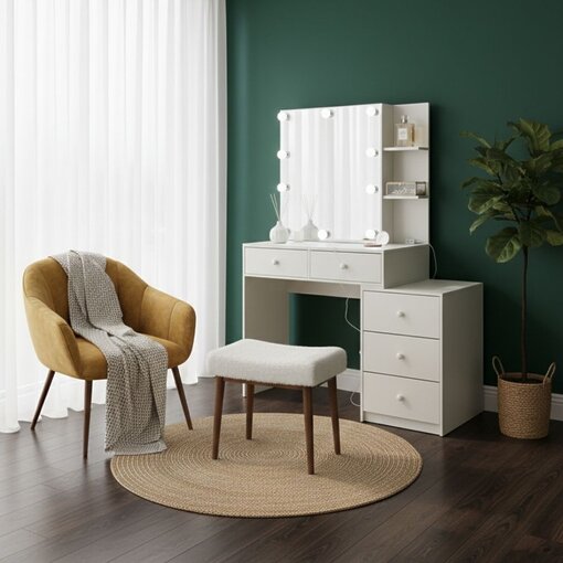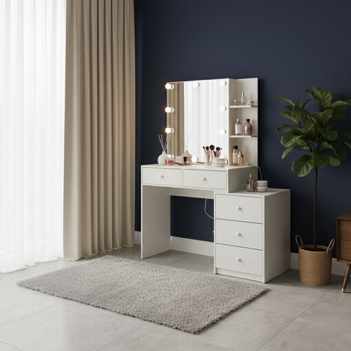 כוללת 5 מגירות, תאורת נורות תלת-צבע להתאמה לכל מצב, ושרפרף מרופד בעור סינתטי רך עם ספוג לנוחות מושלמת. איכות, נוחות ועיצוב מודרני – הכל בשידת איפור אחת.