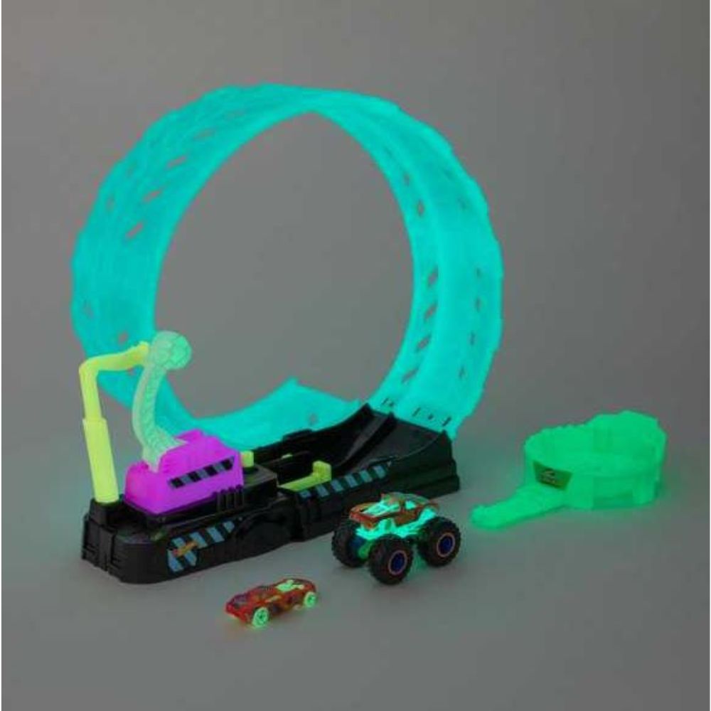 Hot Wheels- מאנסטר טראק מסלול לופ זוהר בחושך+ 2 רכבים