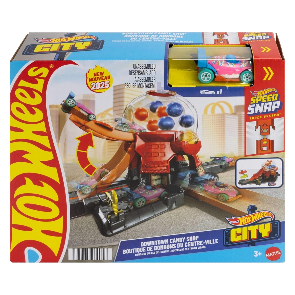 הכניסו קצת מתיקות לאקשן שלכם! ערכת המשחק Hot Wheels Downtown Candy Shop (חנות הממתקים) מציעה שילוב מושלם בין עולם המרוצים המהיר לסיפור סיפורים דמיוני ומדליק. זה המקום שבו מכוניות הופכות לממתקים והמסלולים הופכים למכונות מסטיקים!