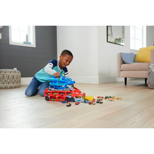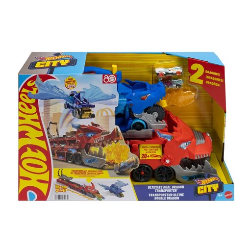ה-Ultimate Dual Dragon של Hot Wheels הוא טרנספורטר ענק שמאחסן מעל 20 מכוניות והופך למסלול מרוצים דו-נתיבי מטורף.