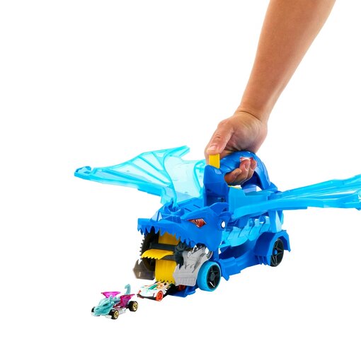 כולל דרקון שבולע מכוניות, להבת אש להעפת מכשולים ו-2 רכבי Hot Wheels במארז.